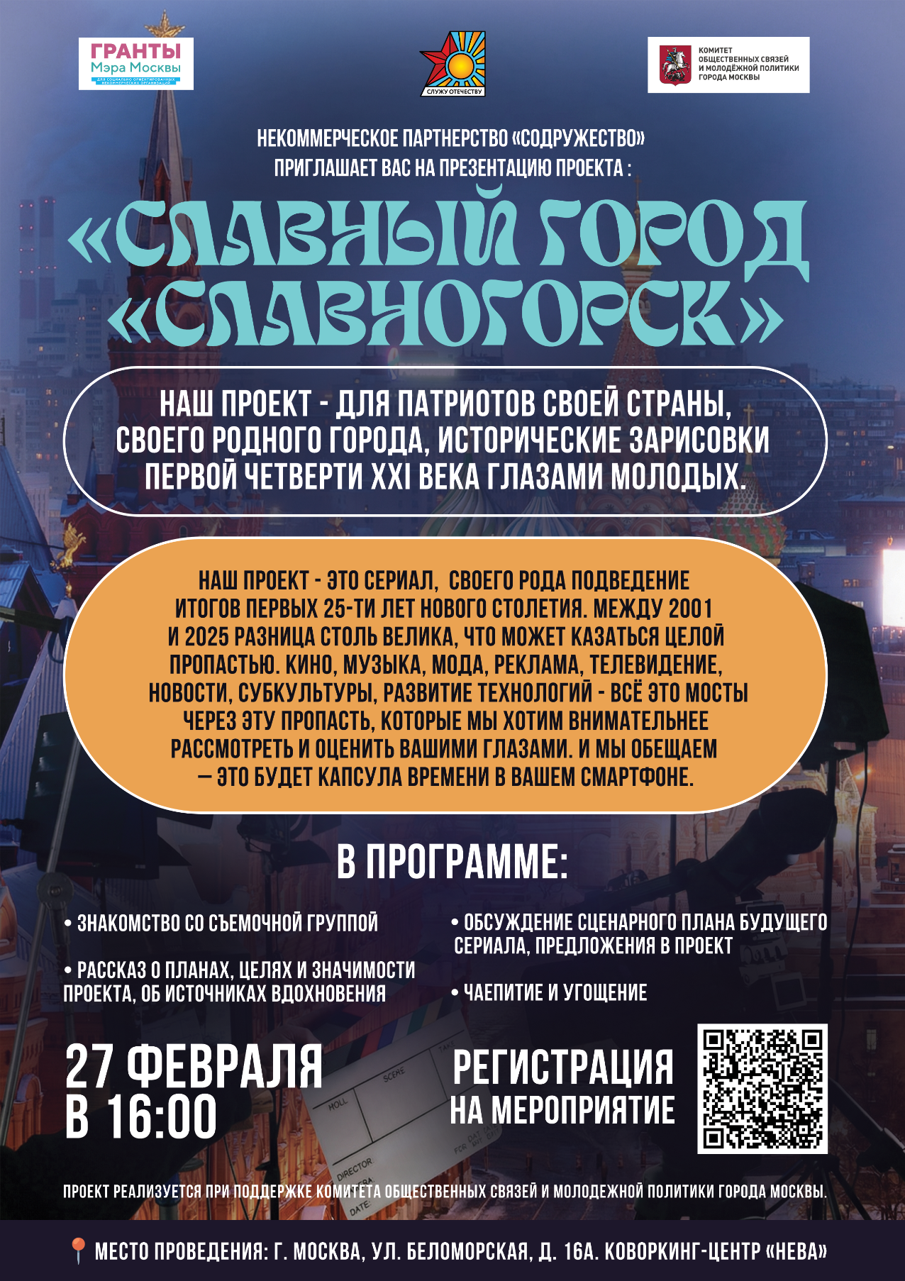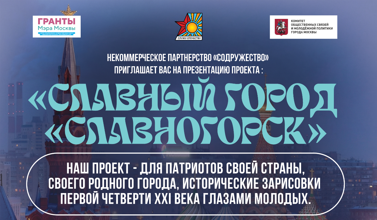 Некоммерческое партнёрство "Содружество" с радостью сообщает о победе в конкурсе Грантов Мэра Москвы 2025 нашего проекта "Славный город "Славногорск". Проект реализуется в 2026 году при поддержке Комитета общественных связей и молодежной политики города Москвы. Следите за нашими анонсами!